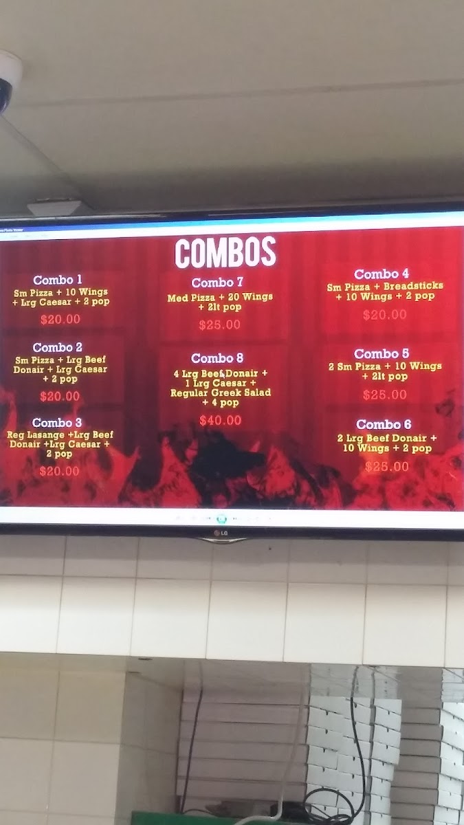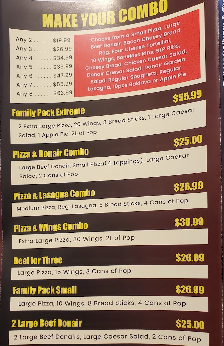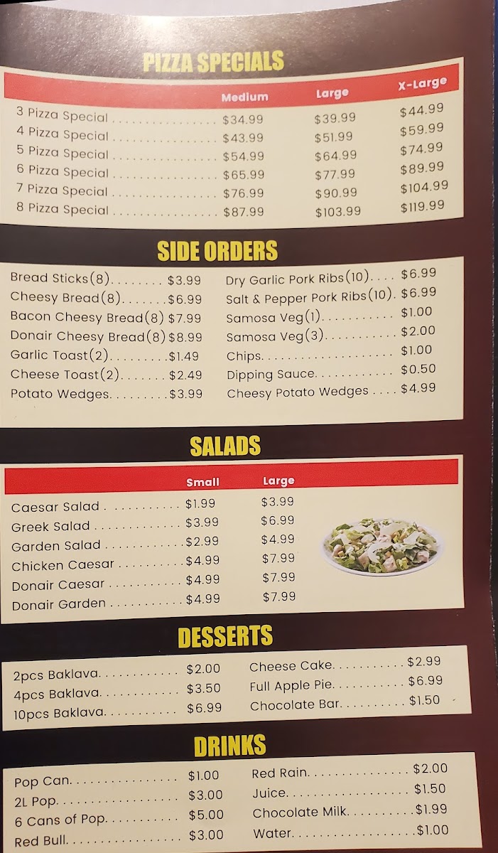 The menu highlights include specialty items such as Donair Pizza, Donair Garden Salad, and Large Beef Donair, indicating a blend of traditional pizza offerings with donair-inspired dishes. Customers often use the menu for quick orders suited to lunch, dinner, or casual meals at any time throughout the day.